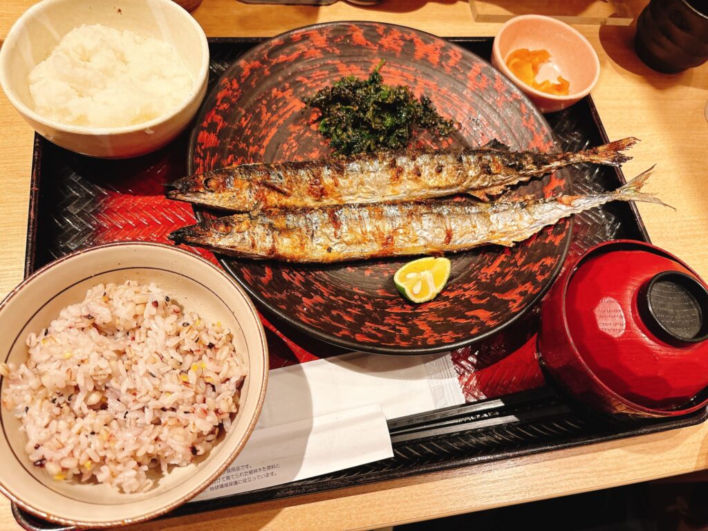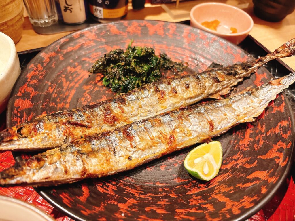 炭火焼ということで、パリッと焼かれ、絶妙な塩加減のサンマで