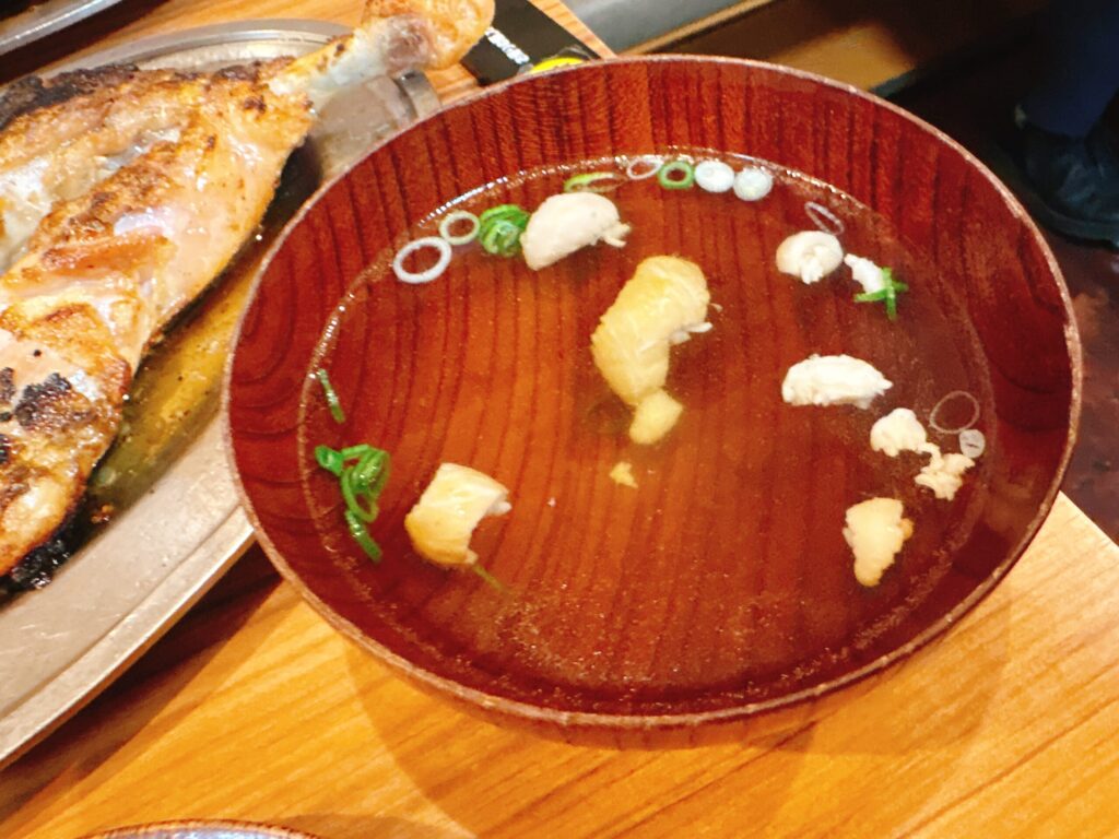 焼いた鶏肉から出た油に、お通しのキャベツやおにぎりを付けて食べるのが