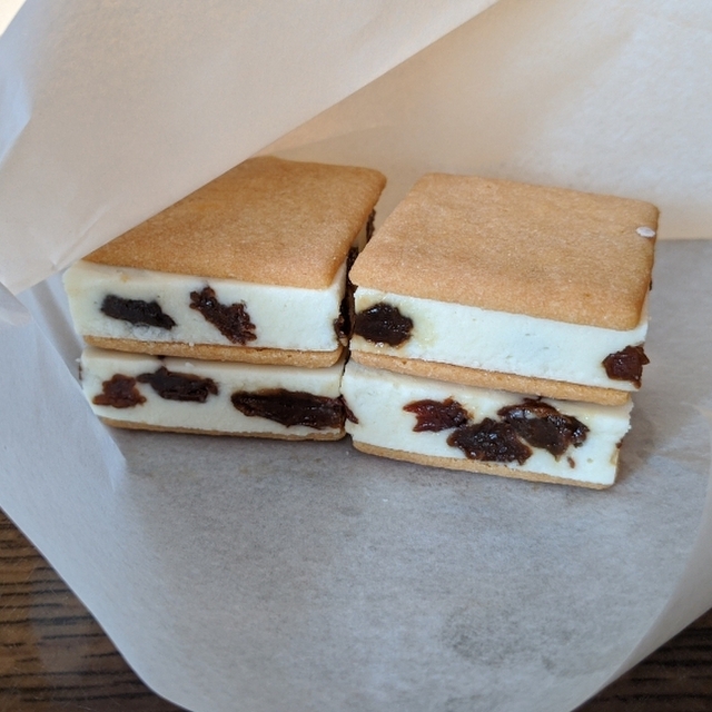 中のチーズが濃厚で、雪やこんこ(カカオビスケット)で冷たいチーズケーキをサンド。